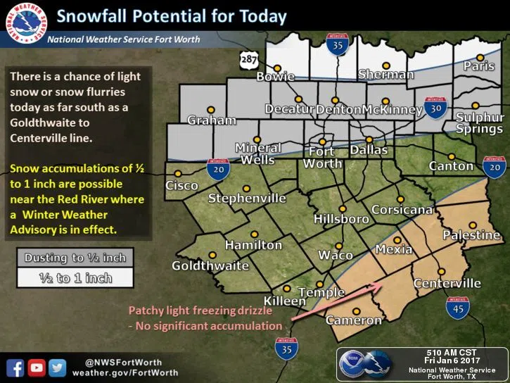 A majority of the accumulation in North Texas will be along the Red River. A Winter Weather Advisory is in effect from 11:00 a.m. to 6:00 p.m. Friday along and north of a line from Bowie to Paris.