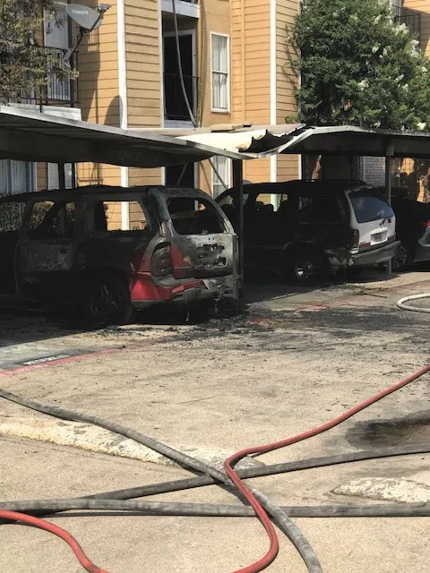 When firefighters arrived they found an SUV burning, underneath a section of covered parking, in front of a thee-story apartment building.