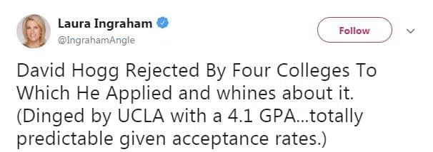David Hogg says Laura Ingraham is a bully because of a tweet she wrote about him… What do you think?