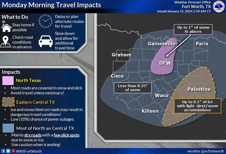 Courtesy National Weather Service DALLAS – (WBAP/KLIF) – North Texas is experiencing scattered snow showers and light winds with wind chill factors below zero farenheit this morning. Drivi...