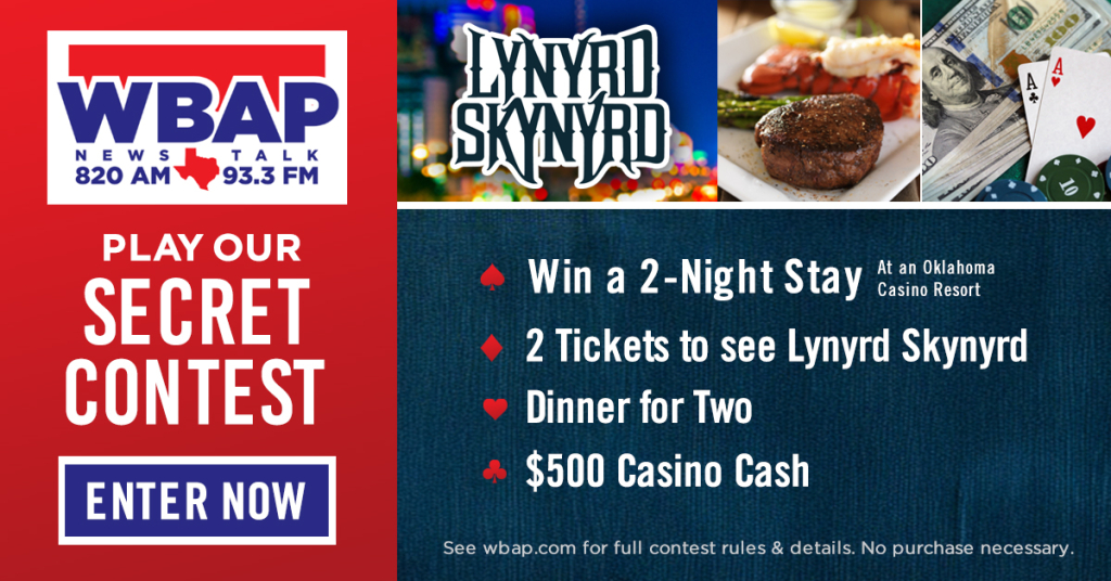 You have been chosen for our Secret Contest! We want to thank you for listening to Newstalk 820AM 93.3FM WBAP with a brand-new Secret Contest. Don’t miss your chance to Win a High Roller Retreat to see Lynyrd Skynyrd $500 in cash and more! The more you play, the more chances you have to win!