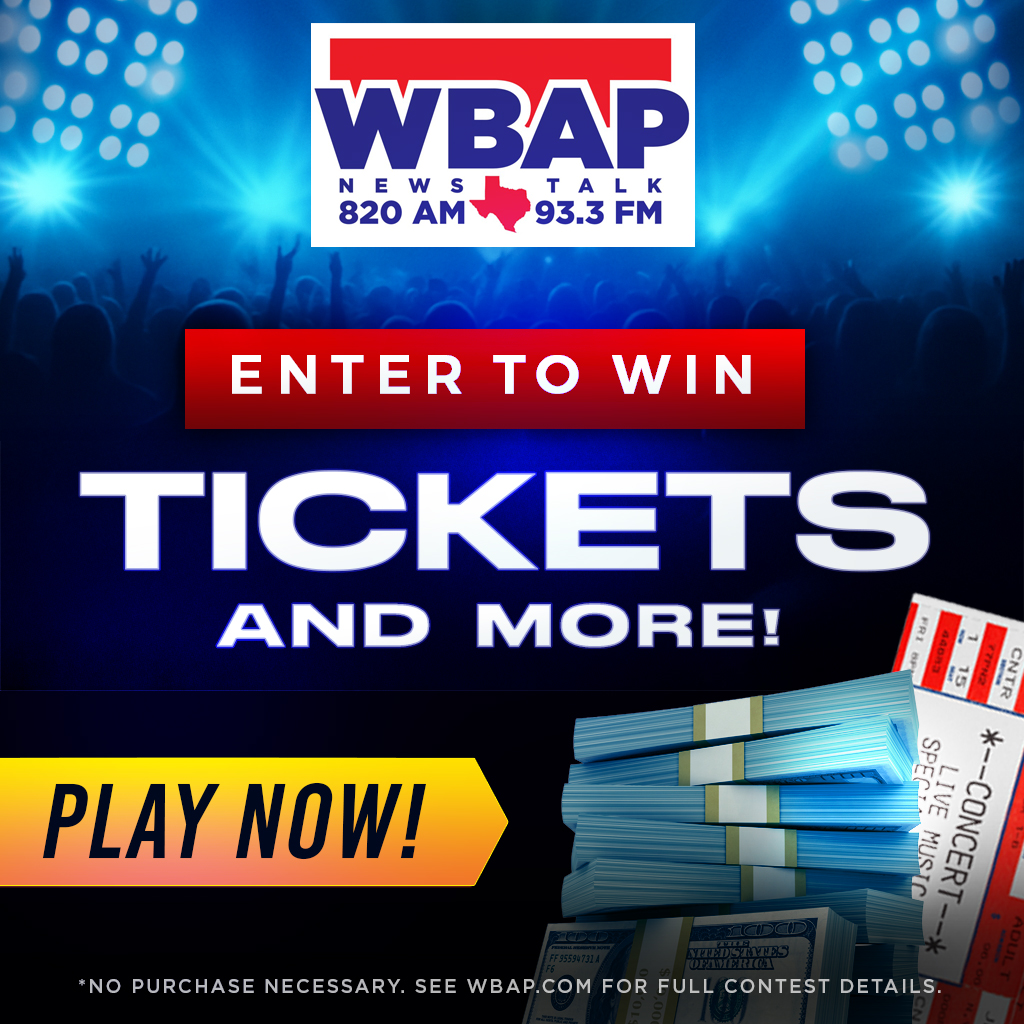 Listen for the [Newstalk 820AM 93.3FM WBAP Salutes]. When you hear it, you can either text the city name to 800-288-9227 to every hour for a chance to win OR you can enter that hour’s city on this page (the form is below)! There are 10 CHANCES TO ENTER every weekday! Example: NEWSTALK 820AM 93.3FM WBAP SALUTES (TOWN NAME). THANK YOU (TOWN NAME) FOR LISTENING TODAY TO NEWSTALK 820AM 93.3FM WBAP…..